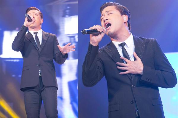 Trên sân khấu trong bộ vest đen lịch lãm Tuấn Hưng say sưa biểu diễn