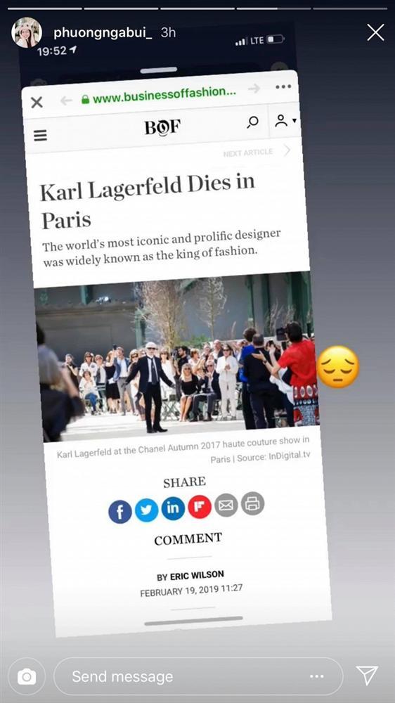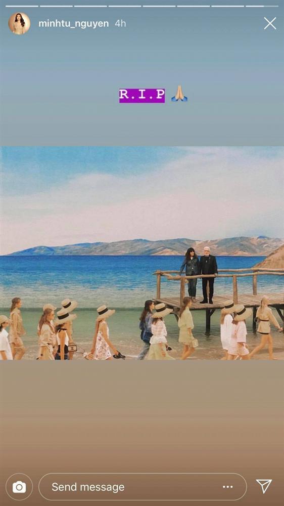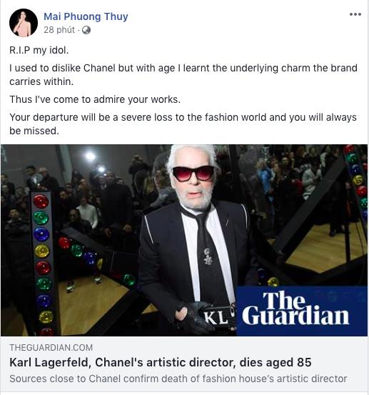 Biết tin 'Ông hoàng Chanel' - Karl Lagerfeld qua đời, Hoa hậu Mai Phương Thúy xúc động viết: "R.I.P my idol. I used to dislike Chanel but with age I learnt the underlying charm the brand carries within. Thus I've come to admire your works. Your departure will be a severe loss to the fashion world and you will always be missed". (Tạm dịch: Thần tượng của tôi hãy yên nghỉ. Tôi đã từng không thích Chanel nhưng ở tuổi này tôi đã học được sự quyến rũ tiềm ẩn của thương hiệu. Vì vậy, tôi đã đến để chiêm ngưỡng các tác phẩm của ông. Sự ra đi của ông sẽ là một mất mát nghiêm trọng đối với thế giới thời trang và ông sẽ không bao giờ bị lãng quên).