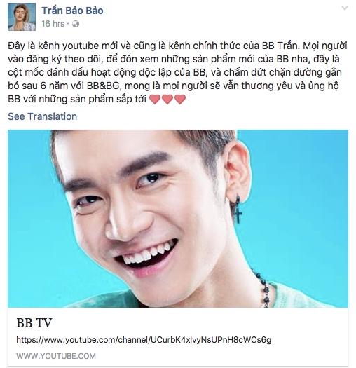 Cụ thể trên Facebook của mình, Trần Bảo Bảo (tên thật của BB Trần) đã chia sẻ kênh Youtube cá nhân cùng với lời tâm sự: "Đây là kênh Youtube mới và cũng là kênh chính thức của BB Trần.