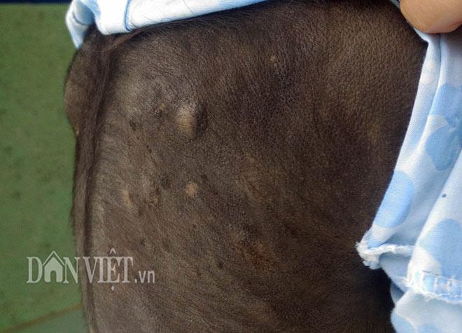 Trên những phần bớt đen, lâu lâu lại mọc lên những mụn nước to bằng ngón tay, khi vỡ ra thì chảy máu, khiến cháu Bích đau đớn (Ảnh: Chúc Ly)