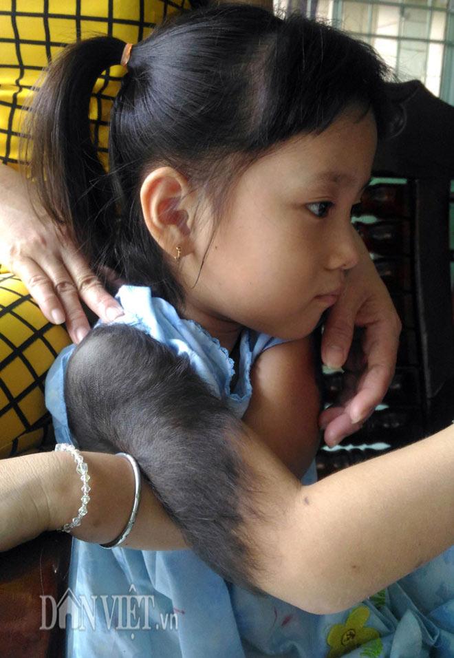 Được biết, từ khi cháu Bích mắc bệnh này, gia đình nhiều lần đưa cháu đi chữa trị nhưng chưa có bác sỹ nào biết chính xác cháu Bích bị bệnh gì. Hiện những đốm đen và lông đã lan sang 2 cánh tay và ngực của cháu Bích.