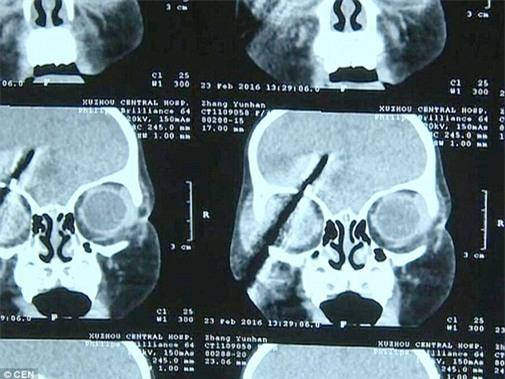 Ngay lập tức, gia đình đã nhanh chóng đưa cô bé đến bệnh viện Trung ương Từ Châu trong tình trạng nguy kịch. Tại đây, các bác sĩ đã thực hiện chụp X-quang và quét CAT để xem mức độ nghiêm trọng của vết thương. Kết quả kiểm tra cho thấy, phần đinh tua vít đâm vào đầu cô bé có độ dài khoảng gần 8 cm nhưng rất may nó đã đi lệch một góc cách mạch máu lớn chỉ vài mm.