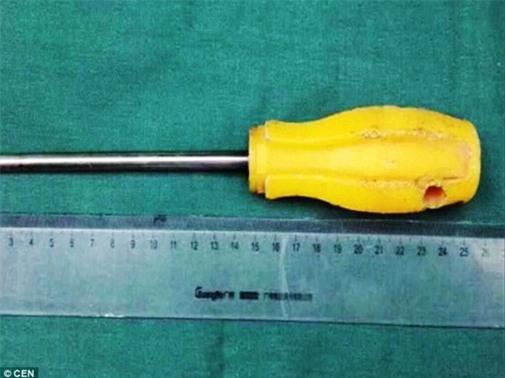 Hình ảnh chiếc tua vít dài hơn 10 cm (bao gồm phần cán) cắm vào đầu bé Hán Hán.
