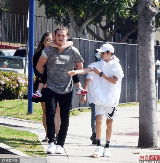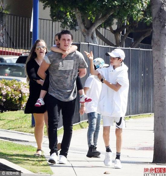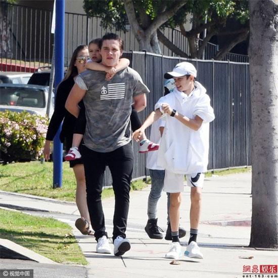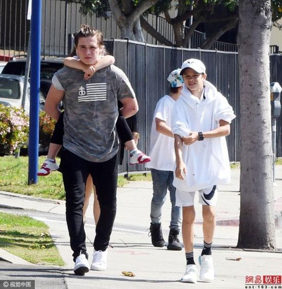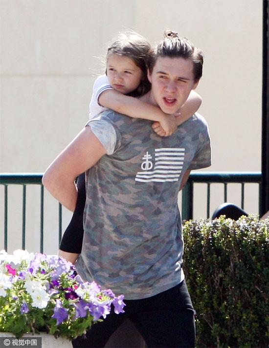 Mới đây, giới săn ảnh bắt gặp Brooklyn Beckham đưa các em đi mua sắm. Là anh lớn trong gia đình nên Brooklyn rất biết cách chăm sóc em gái nhỏ và những lúc mỏi chân, bé Harper được anh bế trên lưng.