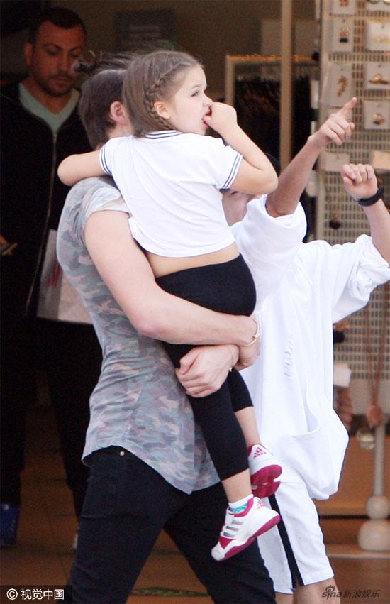 Lần xuất hiện này, bé Harper gây chú ý với chiếc quần legging đen, áo crop top trắng, giày thể thao sành điệu. "Công chúa" nhỏ còn làm điệu với tóc tết viền một bên mái vô cùng đáng yêu, dễ thương.
