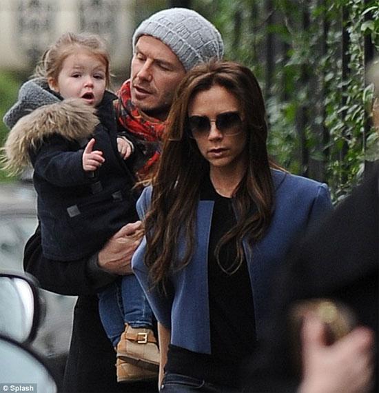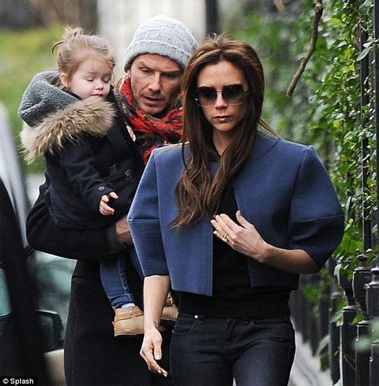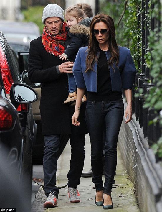 Công chúa nhỏ nhà Becks mặc quần jeans bó, áo dạ cổ lông đi dạo phố với bố mẹ.