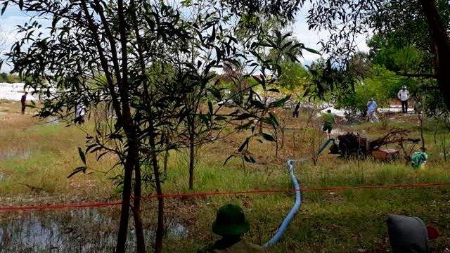 Một chiếc máy bơm với 2 vòi nước lớn được đưa tới hiện trường, rút nước trong hồ, tìm các vật chứng.