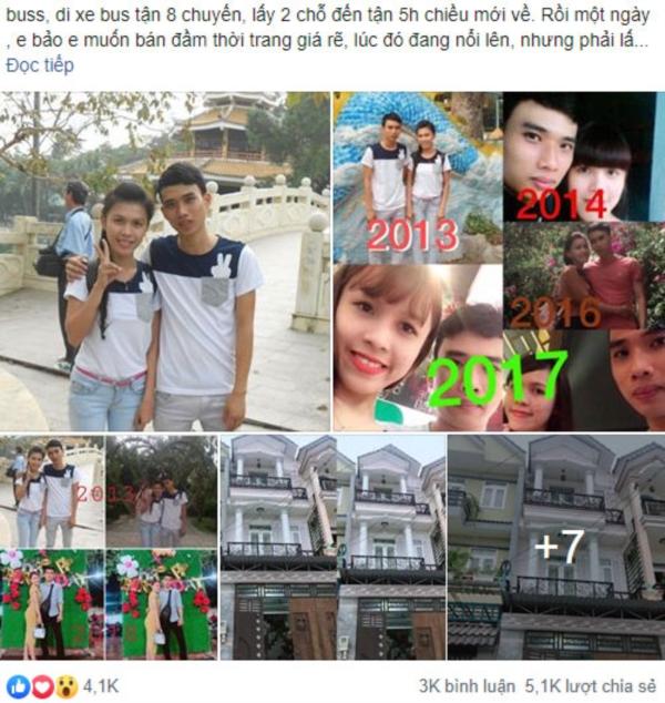 "Một ngày, em bảo em muốn bán đầm thời trang giá rẻ. Lúc đó đang nổi lên nhưng phải lấy sẵn mới bán được vì hàng rất hot. Suy nghĩ mãi, vốn thì chẳng có, gom góp của 2 đứa chỉ vỏn vẹn 900 nghìn nhập được 30 cái đầm về rồi em đăng lên bán. Sau 3 ngày bán hết, lời cộng vốn ra được triệu mấy. Thế là dồn số tiền đó nhập hết hàng về, rồi lại bán hết hàng, rồi lại nhập hàng mới về.