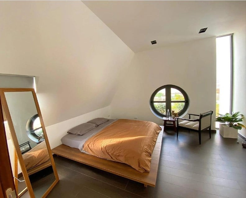 Phòng ngủ được bài trí đơn giản với gam màu nâu – trắng, mỗi phòng đều có cửa sổ lớn, gương đứng và nội thất tiện nghi. Ánh sáng tự nhiên được tận dụng tối đa, mang lại cảm giác dễ chịu.