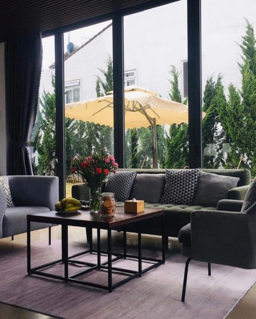 Phòng khách nằm sát khu vườn, ngăn cách bằng vách kính lớn, giúp không gian luôn thoáng đãng và gần gũi thiên nhiên.