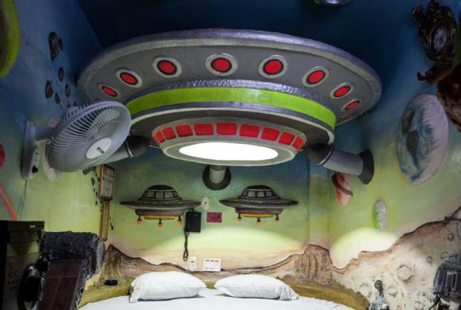 Mỗi phòng được trang trí theo từng chủ đề khác nhau. Trong ảnh là một căn phòng được trang trí theo phong cách tàu vũ trụ.