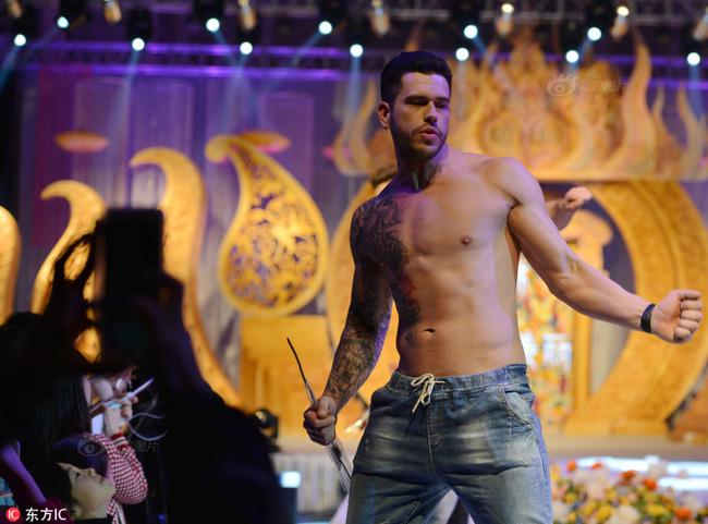 Những anh chàng bảnh bao để trần thân trên không chỉ sải bước catwalk trên sân khấu đầy màu sắc, mà còn thể hiện nhiều tiết mục thú vị như: đứng im như tượng để các nữ nhân viên lên tạo dáng chụp ảnh hay sờ vào bộ ngực rắn chắc, bế các cô gái kiểu công chúa, trao cho họ những nụ hôn nồng nàn...