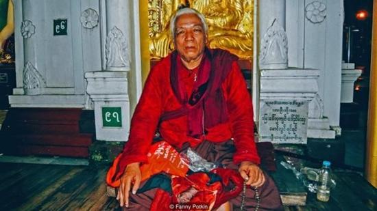 Phù thủy U Aung Baung ngồi ở miếu thờ tại chùa Shwedagon. Ngôi chùa lớn nhất Yangon này là nơi thu hút rất đông phù thủy lẫn người dân. U Aung Baung nói rằng ông 93 tuổi và đã bắt đầu quá trình tu luyện 37 năm nay.