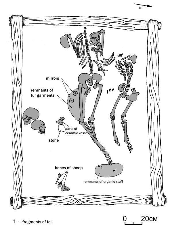 Ngôi mộ được phát hiện có niên đại cách đây khoảng 2.500 năm. Bên trong là hài cốt của một phụ nữ và một đứa trẻ. Cả hai mẹ con đều mặc áo lông thú dát vàng nhưng không có phần đầu.