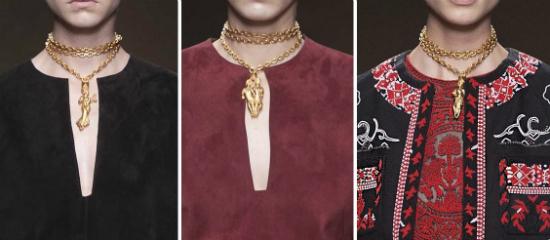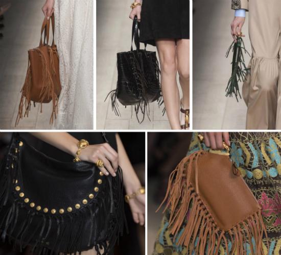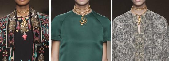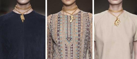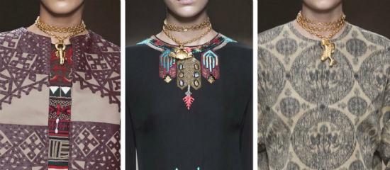 Những thiết kế của Valentino trong mùa này nổi bật với họa tiết dân tộc, cùng với đó là túi xách nhiều tua rua, guốc xỏ ngón kết hợp với trang sức vàng và phụ kiện mạ vàng đi theo xu hướng hoàng đạo. Dây chuyền được mang thành nhiều vòng quanh cổ người mẫu và mỗi dây lại mang một biểu tượng hoàng đạo riêng phù hợp với cá tính của trang phục. Ngoài ra, cá tính hoàng đạo còn thể hiện ở những chiếc vòng tay lớn, được đeo ở một hoặc cả hai bên tay người mẫu.
