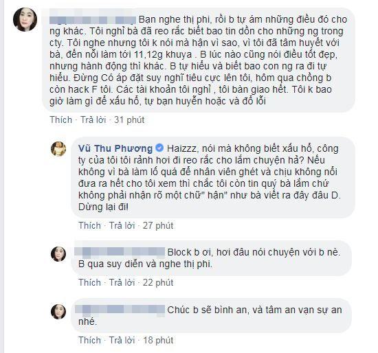 "Nhưng tôi sẽ coi bà như một bài học kinh khủng mà tôi phải trải qua để lớn hơn, hiểu đời và hiểu người hơn và tôi vĩnh viễn không tha thứ và khoan dung lần nữa với một người bạn đã thân tên N.D. Tôi cảnh cáo bà hãy tránh xa tôi, gia đình tôi và nhân viên của tôi. Tôi cấm bà nhắc đến tôi trong mọi hoàn cảnh. Bà không xứng đáng, nhớ nhé", Vũ Thu Phương "dằn mặt".