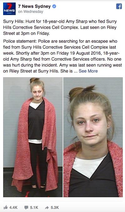 Cách đây vài ngày cảnh sát Úc đang truy tìm Amy Sharp, 18 tuổi sau khi cô gái trẻ này trốn khỏi nơi tạm giữ vào 19.8. Sharp bị bắt giữ vì tội xâm phạm tài sản bất hợp pháp.