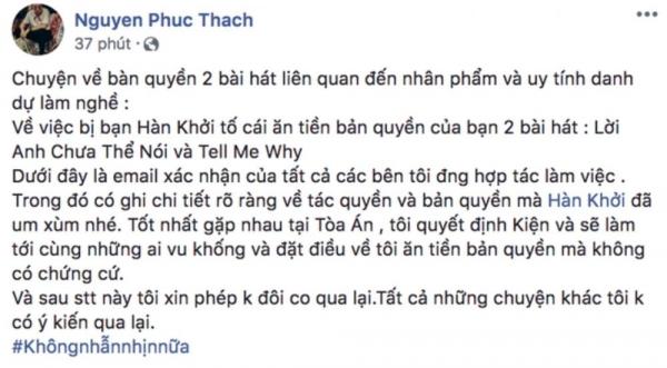 Dòng trạng thái tố cáo Only C ăn chặn tiền 2 ca khúc của Hàn Khởi