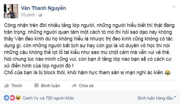 Qua status, có thể thấy Vân Hugo khá bức xúc khi lối sống lạc quan vui vẻ của mình bị chỉ trích. Cô cũng cho biết đã thẳng tay "block" người đã cư xử phũ phàng với mình.