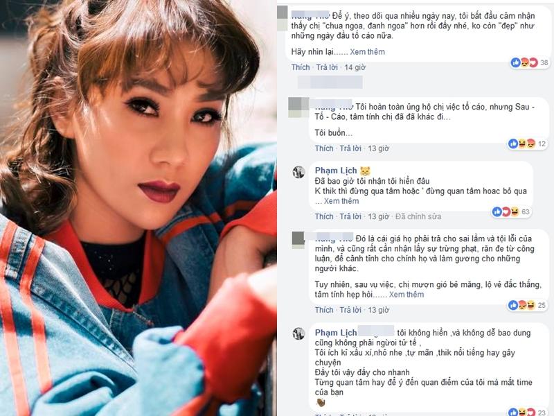 Tôi hoàn toàn ủng hộ chị việc tố cáo, nhưng sau tố cáo tâm tính chị đã đã khác đi. Chị mượn gió bẻ măng, lộ vẻ đắc thắng, tâm tính hẹp hòi. Tôi xin lỗi chị nếu những cảm nhận của tôi có thể làm chị buồn nhưng tôi không thể không nói... Nếu có, tôi mong chị sửa. Còn nếu không, tôi xin tự mình hối lỗi với chị. Thật lòng tôi hơi thất vọng câu trả lời này của chị. Tôi buồn... Hãy nhìn lại... Phạm Lịch", một Faceboker nhận định.