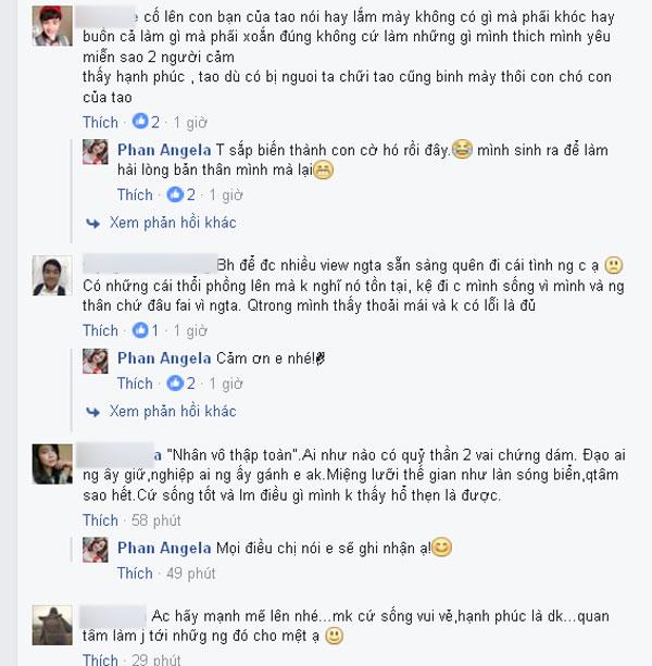 Angela viết: "Định sẽ không nói ra, nhưng con người các người sống quá ác. Dồn người khác vào đường cùng thêm lần nửa, cũng vì khẩu nghiệp của các người hại 1 người đang cố gắng sống tìm lại mọi thứ thì các người lại khiến người khác như kẻ tội đồ! Lương tâm các người ở đâu?