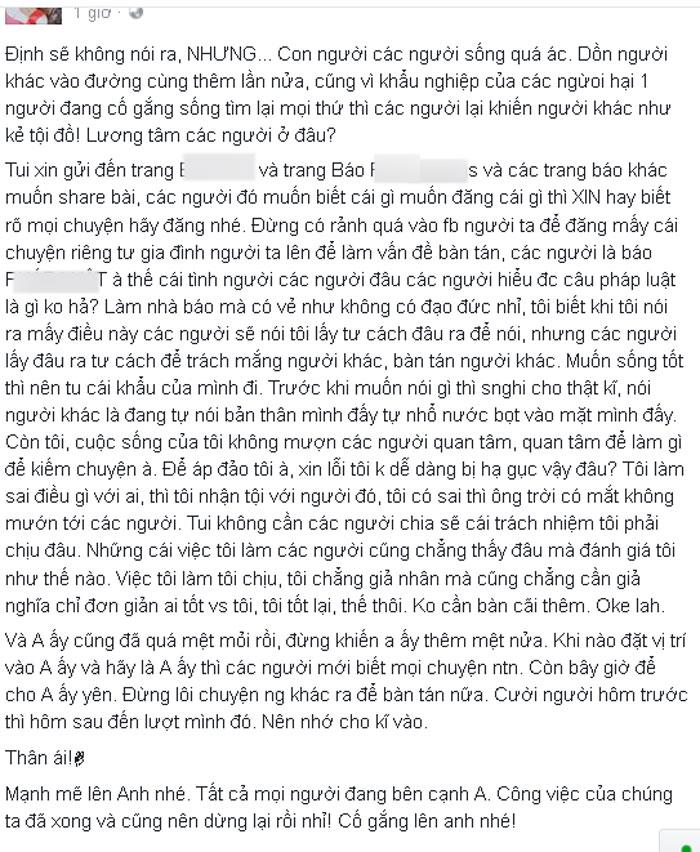 Tui xin gửi đến trang B. và các trang báo khác. Các người đó muốn biết cái gì muốn đăng cái gì thì XIN hay biết rõ mọi chuyện hãy đăng nhé. Đừng có rảnh quá vào facebook người ta để đăng mấy cái chuyện riêng tư gia đình người ta lên để làm vấn đề bàn tán. Các người là báo thế cái tình người các người đâu các người hiểu được câu pháp luật là gì không hả? Làm nhà báo mà có vẻ như không có đạo đức nhỉ, tôi biết khi tôi nói ra mấy điều này các người sẽ nói tôi lấy tư cách đâu ra để nói, nhưng các người lấy đâu ra tư cách để trách mắng người khác, bàn tán người khác. Muốn sống tốt thì nên tu cái khẩu của mình đi. Trước khi muốn nói gì thì suy nghĩ cho thật kĩ, nói người khác là đang tự nói bản thân mình đấy tự nhổ nước bọt vào mặt mình đấy. Còn tôi, cuộc sống của tôi không mượn các người quan tâm, quan tâm để làm gì để kiếm chuyện à. Để áp đảo tôi à, xin lỗi tôi không dễ dàng bị hạ gục vậy đâu? Tôi làm sai điều gì với ai, thì tôi nhận tội với người đó, tôi có sai thì ông trời có mắt không mướn tới các người. Tui không cần các người chia sẽ cái trách nhiệm tôi phải chịu đâu. Những cái việc tôi làm các người cũng chẳng thấy đâu mà đánh giá tôi như thế nào. Việc tôi làm tôi chịu, tôi chẳng giả nhân mà cũng chẳng cần giả nghĩa chỉ đơn giản ai tốt với tôi, tôi tốt lại, thế thôi. Không cần bàn cãi thêm. Ok.