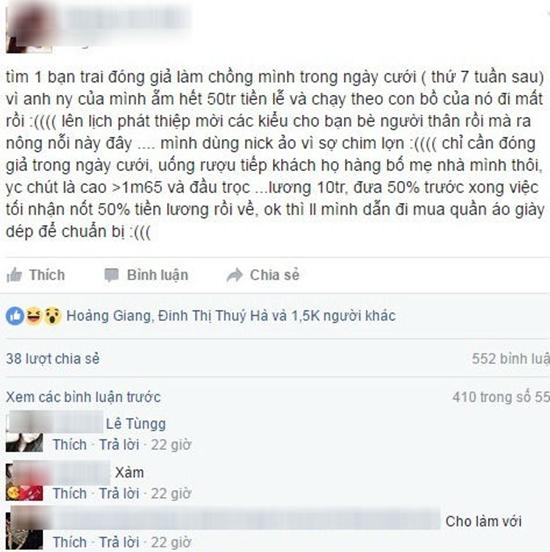 Mới đây, cư dân mạng lại xôn xao về việc một cô gái có facebook Hoàng Lan Anh lên mạng xã hội đăng thông tin tìm người đóng giả chồng trong ngày cưới sắp được tổ chức.