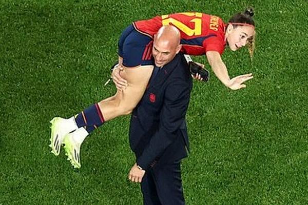 Trong bức hình đăng tải trên nhiều tờ báo lớn Tây Ban Nha, vị Chủ tịch Liên đoàn bóng đá Tây Ban Nha bế thốc Athenea del Castillo lên vai trong lúc ăn mừng chiến thắng.