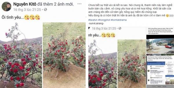 Phía dưới bài đăng này, cư dân mạng ngay lập tức tìm ra và công khai hình ảnh, tên tuổi của người bị nghi ăn cắp hoa hồng chính là Nguyên Kitô. Sở dĩ, người này bị nghi là “thủ phạm” vì trên trang cá nhân của anh đã đăng 2 hình ảnh cây hoa hồng giống hệt cây hoa hồng bị mất cắp của Hà Văn Lương.