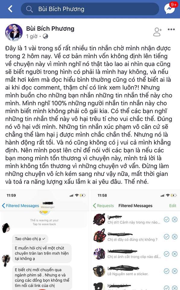 “Về cơ bản mình vốn không định lên tiếng về chuyện này vì mình nghĩ nó thật tào lao ai nhìn qua cũng sẽ biết người trong hình có phải là mình hay không, và nếu mắt hơi kém mà đọc hiểu bình thường cũng có thể biết ai là ai khi đọc comment, thậm chí có link xem luôn! Mình nghĩ 100% những người nhắn tin nhắn này biết mình không phải cô gái kia. Nó vô hại với mình. Những tin nhắn xúc phạm vô căn cứ sẽ chẳng thể làm hại gì được mình nhưng nó là hành động rất tồi và cũng không có gì vui cả", Bích Phương nói.