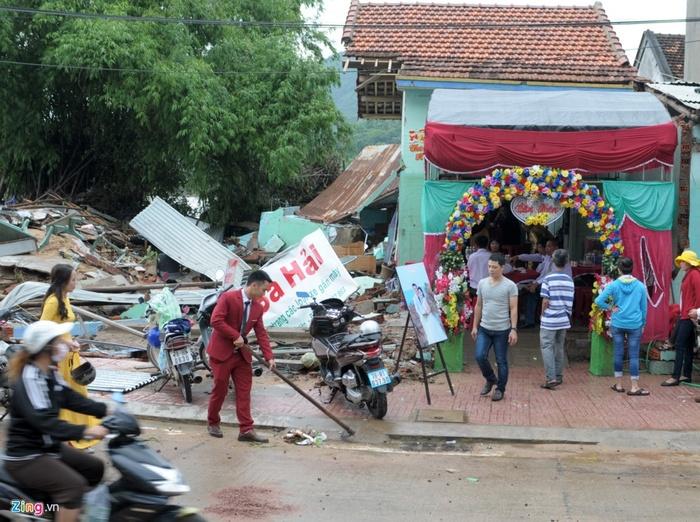 Theo đó, vợ chồng ông Nguyễn Văn Hải (ngụ huyện Đồng Xuân, Phú Yên) ngậm ngùi tổ chức đám cưới cho con trai trong phần nhà tan hoang còn lại.