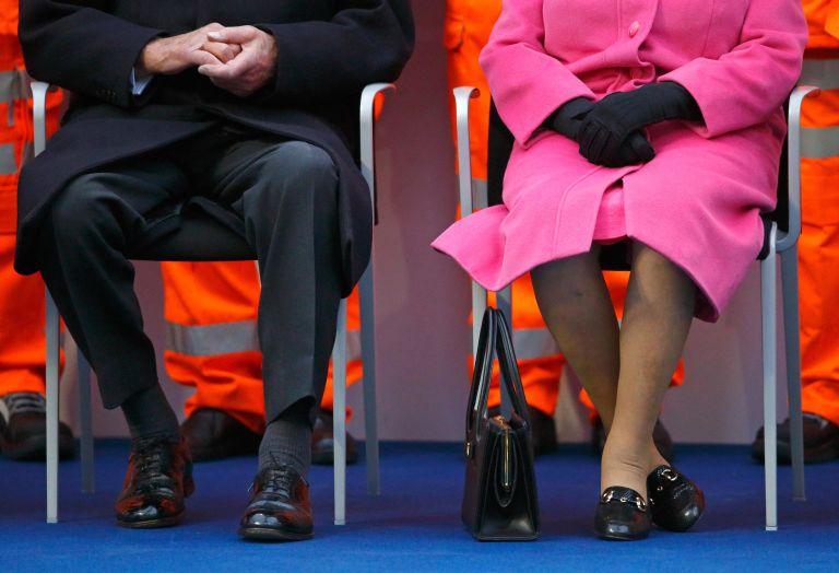 Nữ hoàng Anh Elizabeth II đặt chiếc túi xách của bà trên sàn nhà trong một sự kiện.