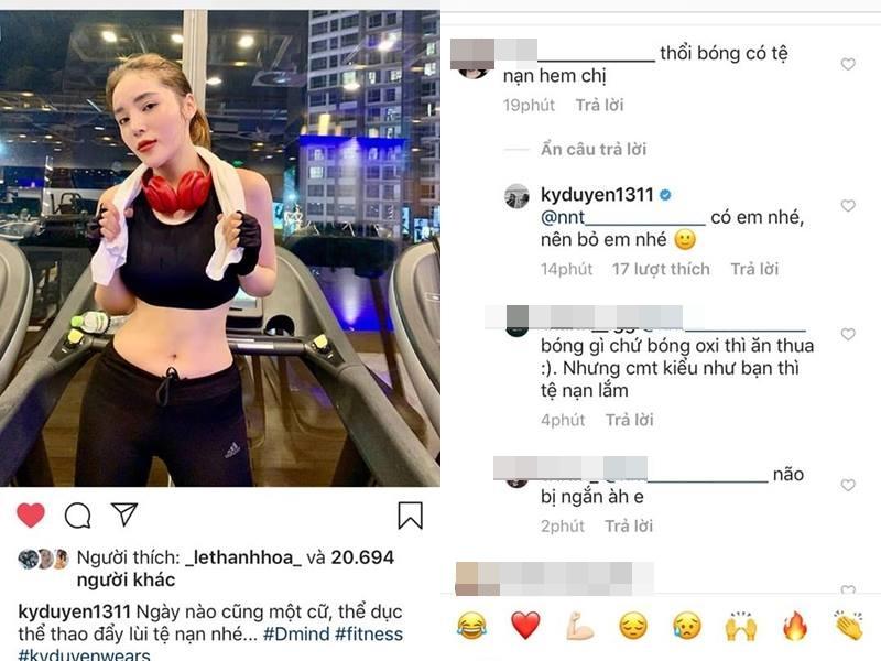 Dòng trạng thái nhắc nhở bản thân "thể dục thể thao đẩy lùi tệ nạn" đã vô tình đưa Kỳ Duyên vào thị phi. Một anti-fan bất ngờ nhắc lại quá khứ từng khiến cô mất điểm trước công chúng. Khi bị mỉa mai "Thổi bóng có tệ nạn không chị?", nàng hậu nhẹ nhàng: "Có em nhé, nên bỏ đi".
