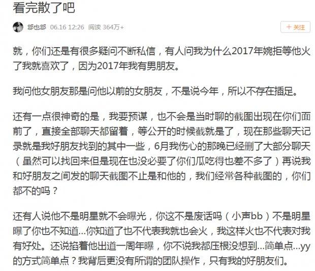 Còn về việc các bạn nói tôi đã linh tính, sắp xếp trước, đem tất cả những cuộc trò chuyện lưu giữ lại, rồi đến thời cơ chỉ cần chụp tải xuống rồi tung ra. Thật ra những bức ảnh nhật ký trò chuyện đó chỉ là một phần nhỏ do bạn thân của tôi tìm ra được do lúc trước tôi có gửi cho cô ấy, vào buổi tối tháng 6 đau buồn đó, tôi đã xóa hết toàn bộ cuộc trò chuyện rồi. Tôi và bạn thân của tôi chụp lại không chỉ có cuộc trò chuyện với Hồ Nhất Thiên mà chúng tôi thường hay có mấy kiểu chụp hình như thế này.