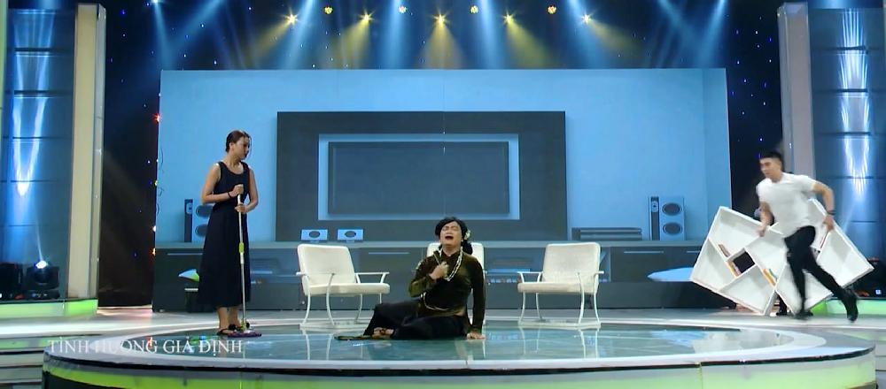 Theo đó, người mẫu 26 tuổi vào vai con dâu cùng "mẹ chồng" (do stylist Trịnh Tú Trung thủ vai) hợp lực đưa ra thử thách dành cho quý ông Đức Lợi. Ngay đầu tình huống, top 8 Tôi là diễn viên 2015 và mẹ chồng đã xảy ra một trận xô xát lớn.