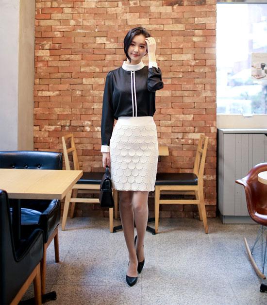 Bên cạnh đó, với những bạn gái có chiều cao tương đối hoàn toàn có thể diện dáng chân váy bút chì dài qua đầu gối cũng khá thanh lịch và phong cách.