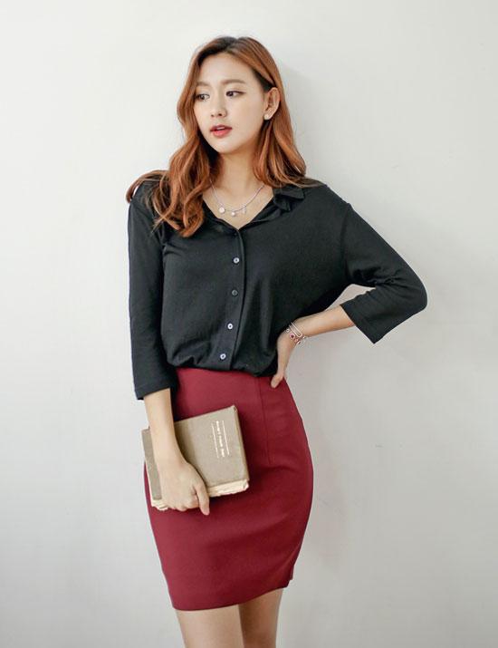 Dáng chân váy bút chì phổ biến được quý cô công sở yêu thích là dáng chân váy thiết kế đơn giản, có chiều dài trên đầu gối. Dáng chân váy bút chì ngắn không chỉ trẻ trung mà còn giúp bạn tôn chiều cao đáng kể.