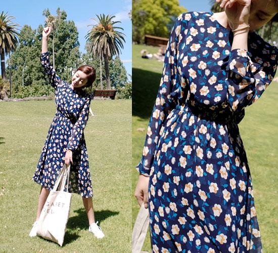 Nếu sở hữu chiều cao tương đối bạn có thể diện váy hoa có chiều dài qua đầu gối sẽ cực phong cách.