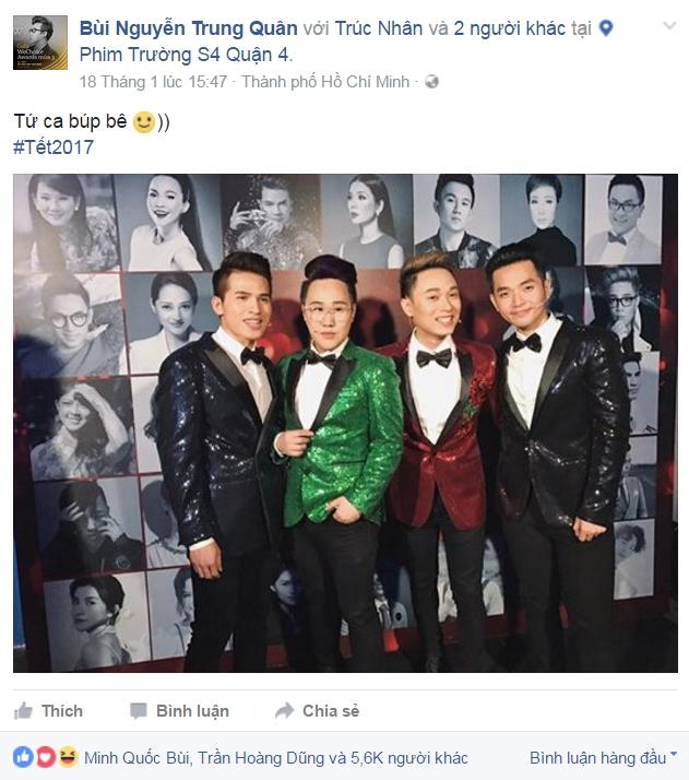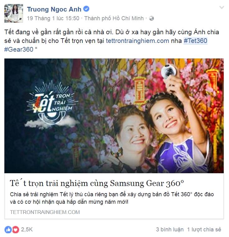 Năm nay, hai mẹ con ca sĩ Trung Quân idol không ăn Tết cùng nhau do mẹ anh đang ở Mỹ, còn anh thì miệt mài chạy show. Dù cách nhau đến nửa vòng trái đất, nhưng nam ca sĩ vẫn yên tâm đón Tết cùng bạn bè vì đã có những trợ thủ công nghệ như Galaxy S7 edge, Gear 360, Gear VR… giúp lưu lại từng khoảnh khắc ấm áp ngày Tết và chia sẻ cho gia đình. (Hình trên trang cá nhân của nhân vật)