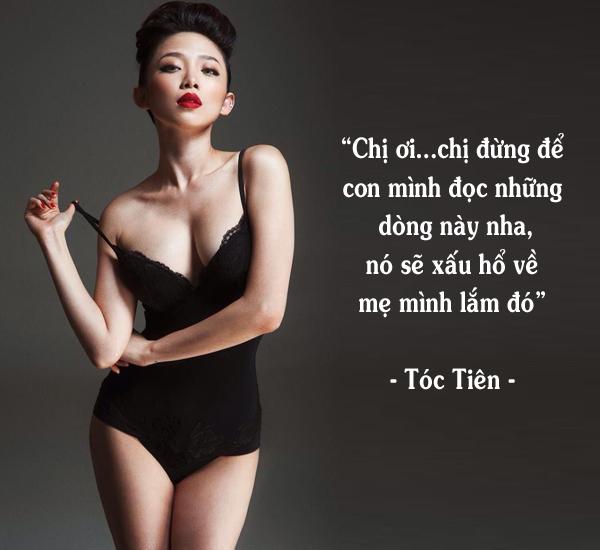 Là ca sĩ nổi tiếng thẳng thắn và cá tính, Tóc Tiên mở lời đáp trả sâu cay, cảm xúc vẫn còn nguyên tức giận: "Chị ơi, chị đừng để con mình đọc những dòng này nha. Nó sẽ xấu hổ về mẹ mình lắm đó". Trước đó, một Facebooker nhận xét mỹ nhân họ Nguyễn khi nhìn ảnh cô mặc áo tắm: "Thấy gớm. Cởi truồng luôn đi cho dễ coi hơn".
