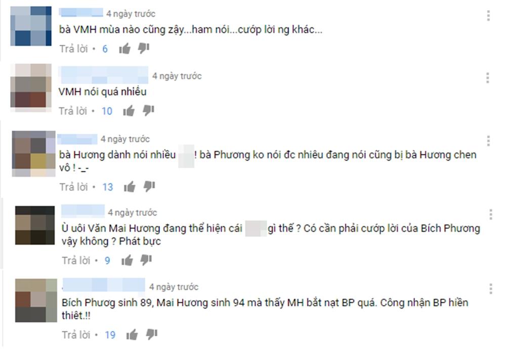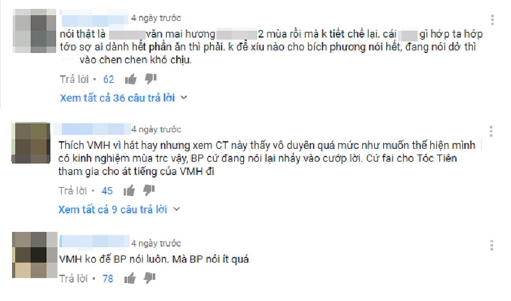 "Thích Văn Mai Hương vì hát hay nhưng xem chương trình này thấy vô duyên quá mức, như muốn thể hiện mình có kinh nghiệm vậy. Bích Phương cứ đang nói lại nhảy vào cướp lời. Cứ phải cho Tóc Tiên tham gia cho át tiếng của Văn Mai Hương đi".