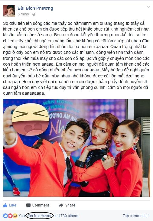 Ngay sau khi sự việc được chia sẻ trên mạng xã hội, Bích Phương đã lên tiếng minh oan cho đàn chị. Giọng ca Bao giờ lấy chồng tâm sự: "Bọn em đoàn kết yêu thương nhau, kết tóc se tơ chị em cây khế chị ngã em nâng lắm chứ không có cãi lộn cướp lời nhau đâu, mong mọi người đừng hiểu nhầm tội ba bọn em".
