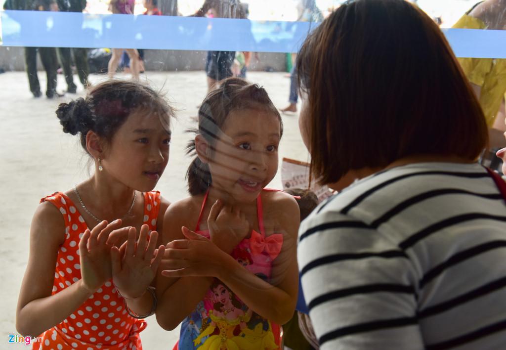 Một người phụ nữ tới từ huyện Ba Vì cho biết chị đưa con, cháu đi hơn 30 km, đến đây từ 7h. Tuy nhiên, lượng người xếp hàng quá đông, chị phải nhờ người khác mua được 3 vé cho con cháu vào chơi và đành đứng ngoài đợi.