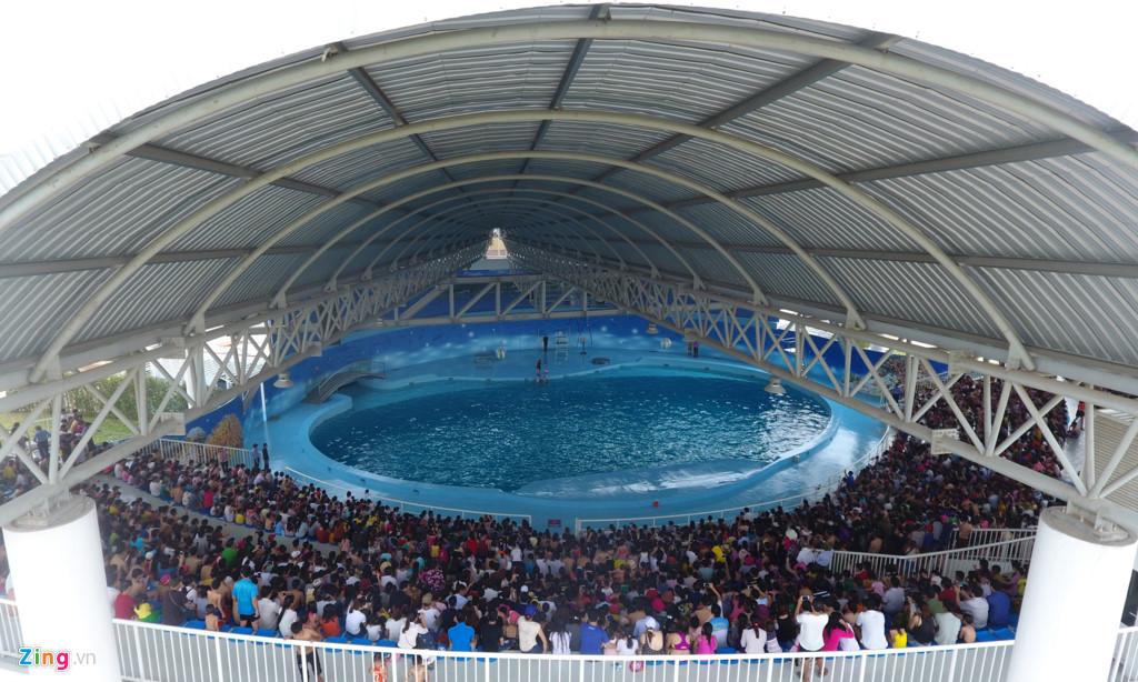 Bên trong khu du lịch quốc tế Tuần Châu, khán giả chật kín ở khu biểu diễn cá heo, hải cẩu.