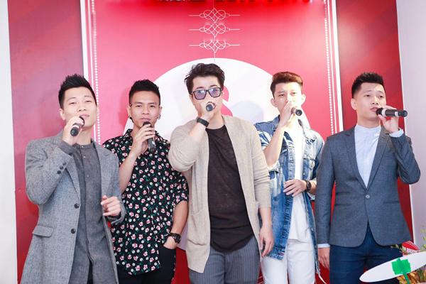 Bốn chàng trai trong nhóm Oplus cùng Đinh Mạnh Ninh hát tặng quan khách tại sự kiện.
