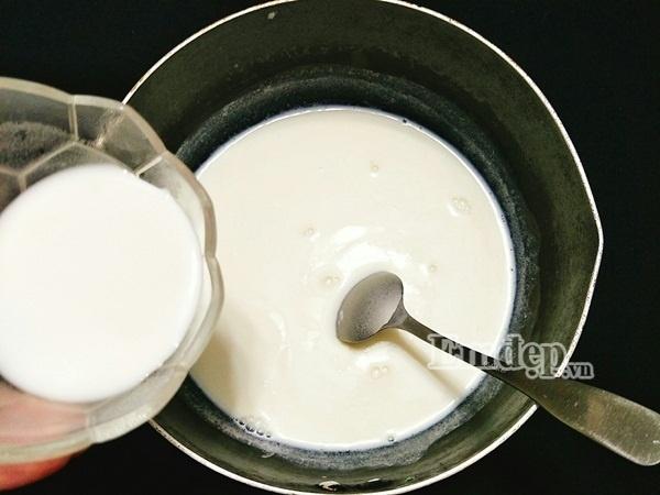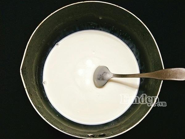 Bước 4: Khi hỗn hợp sữa ấm thì nhanh tay cho bát bột năng vào khuấy đều, nấu cho hỗn hợp sôi trở lại là tắt bếp. Trong quá trình nấu, bạn nên khuấy nhẹ liên tục để không bị dính đáy nồi nhé!