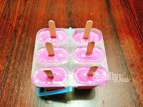 Bước 6: Rót hỗn hợp kem thanh long vào các khuôn, đợi cho kem nguội rồi cất ngăn đá 7-8 tiếng là có thể lấy kem ra thưởng thức.