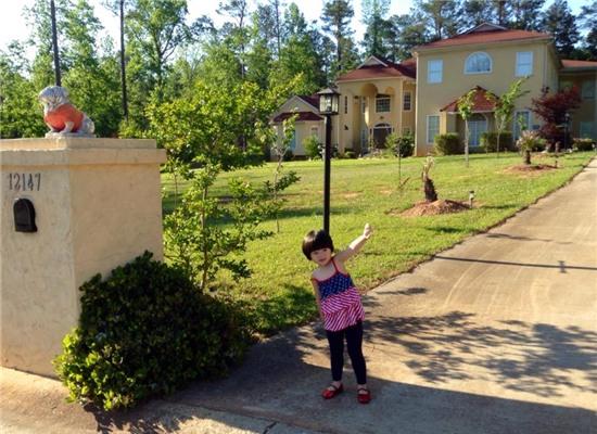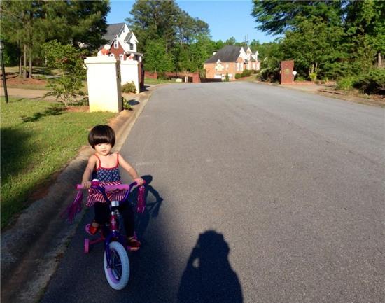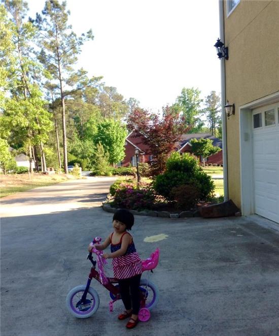 Con gái chị - bé Nguyệt Cát rất thích chơi đùa và đạp xe trong sân.