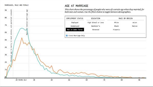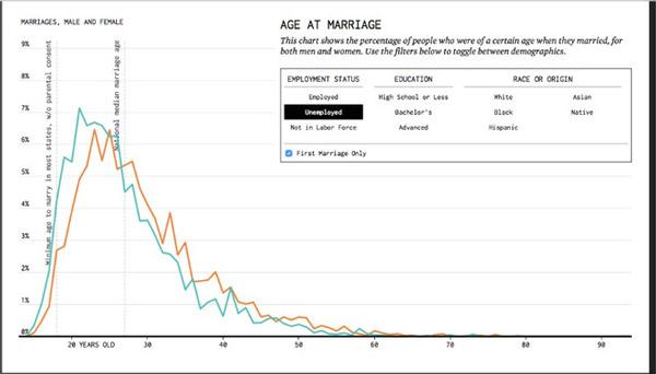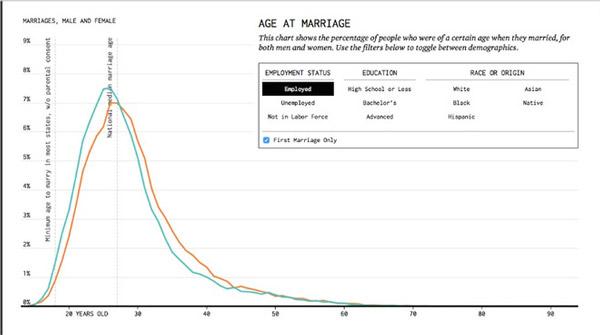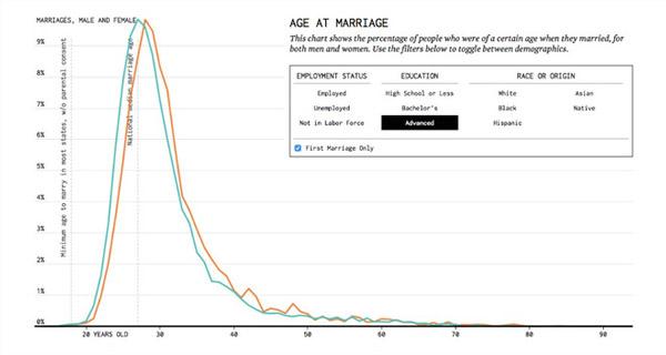 Tuy nhiên, bằng cách sử dụng dữ liệu từ American Community Survey (Khảo sát người dân Mỹ), từ năm 2009 tới 2014 sau đó lập biểu đồ toán học, Nathan Yau, một nhà thống kê có thể dự đoán khi nào một người Mỹ kết hôn.