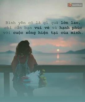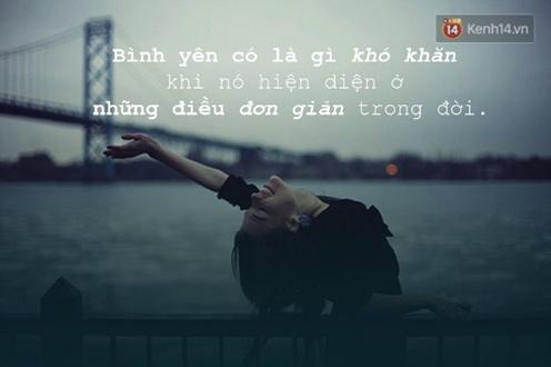 10. Bình yên có là gì quá lớn lao, chỉ cần bạn vui vẻ và hạnh phúc với cuộc sống hiện tại của mình. Người ta chỉ bình yên khi biết rằng mình đang sở hữu những thứ mà rất nhiều người không có, và vẫn trong quá trình hoàn thành những ước muốn chưa đạt được. Bạn được ăn uống đầy đủ, ngủ nghỉ thoải mái, có quần áo đẹp để mặc, có bạn bè, đồng nghiệp xung quanh. Đó là những điều nho nhỏ những rất đủ và đầy để bạn có thể hài lòng với cuộc sống của mình.